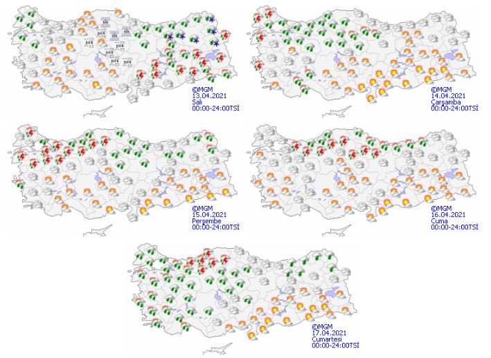 Yağışların; genellikle yağmur ve sağanak, yer yer gök gürültülü sağanak, Doğu Karadeniz'in iç kesimleri ile Doğu Anadolu'nun kuzey kesimlerinin yükseklerinde yer yer karla karışık yağmur ve kar şeklinde olması bekleniyor. Bu sabah ve gece saatlerinde iç kesimlerde buzlanma ve don olayı ile Orta Karadeniz'in iç kesimleri ve İç Anadolu'nun kuzeyinde yer yer sis ve pus olayı bekleniyor.