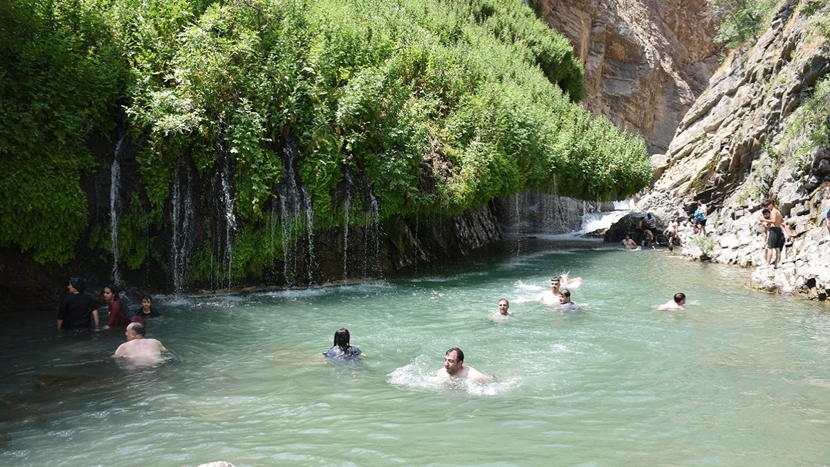 Doğayla iç içe zaman geçirmek için şelaleye gelenler, piknik yapıp, serin suda yüzerek serinlemeye çalışıyor.