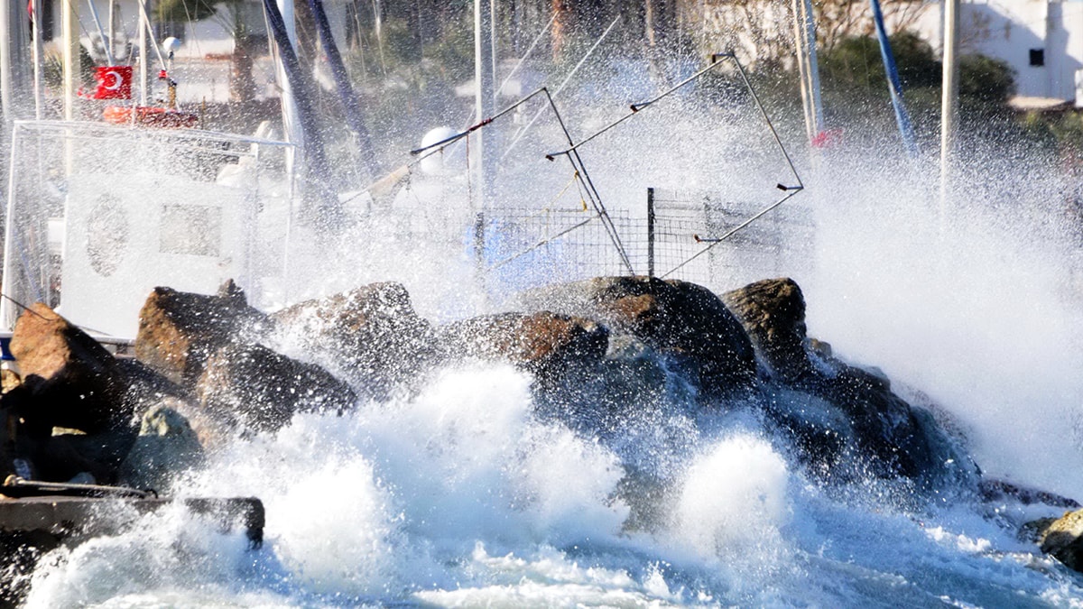 Bodrum’da şiddetli lodos nedeniyle Güllük limanından hareket eden kuruyük gemileri Bodrum koylarına sığınmak zorunda kalırken küçük ve amatör balıkçı kayıkları dalgaların etkisi ile karaya sürüklendi.