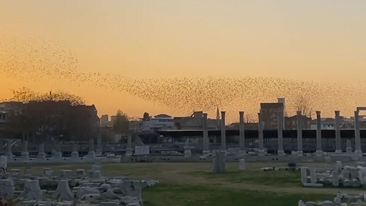 Yüzyıllarca birçok medeniyete ev sahipliği yapan antik kentin üzerinde gün batımı saatlerinde sığırcıklar belirdi.