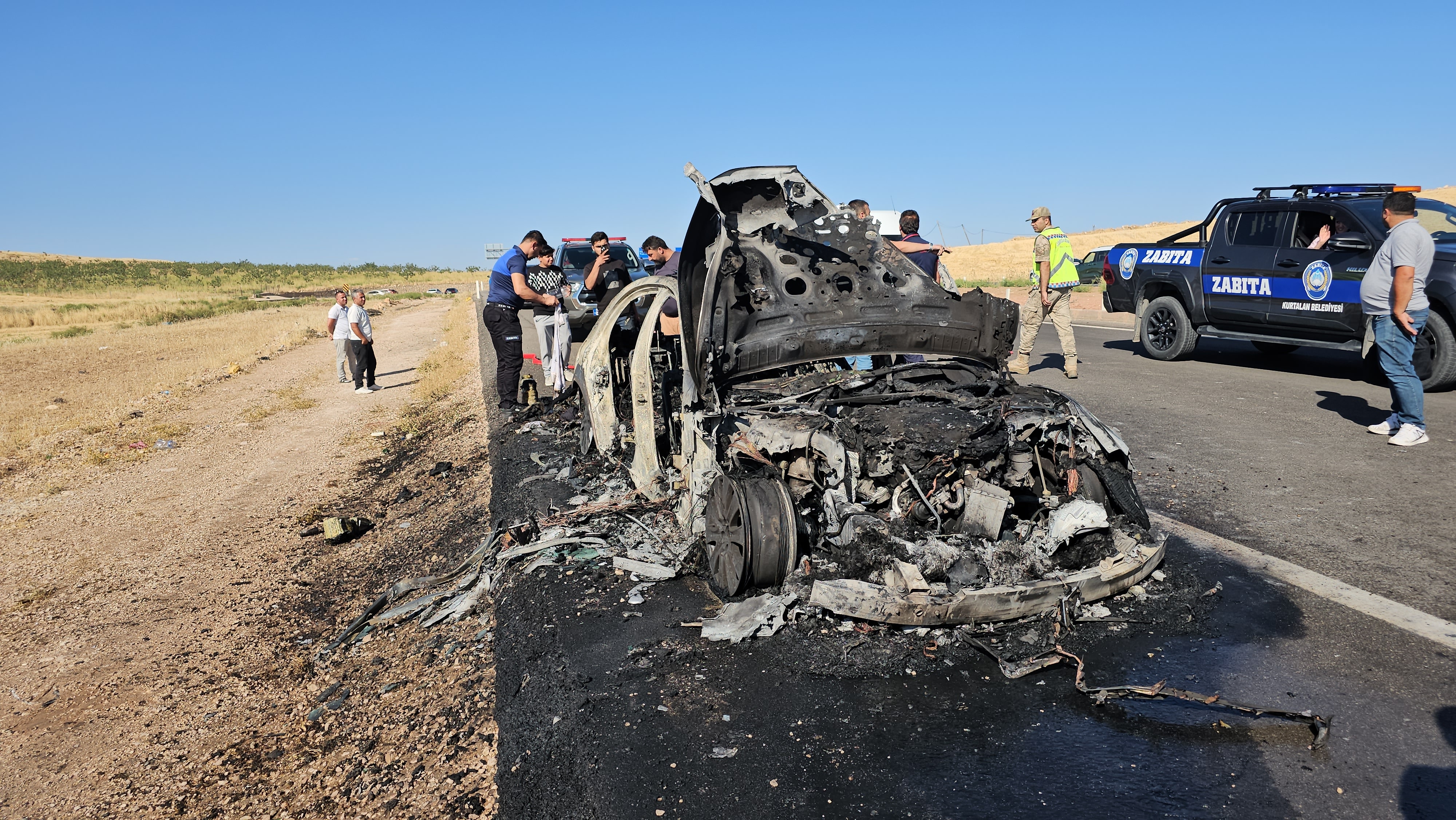 Durumu fark ederek aracı yol kenarına çeken sürücü ile beraberindeki yolcu araçtan indi.
