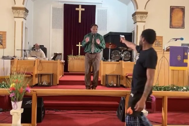 Kilisenin kamerasına yansıyan görüntülerde, saldırganın silah çektiğini gören Germany’nin hızlı kendisini kürsünün arkasına attığı, saldırganın ise Germany’e doğru yöneldiği görüldü. Daha sonra McCallister, saldırgana arkadan yaklaşarak etkisiz hale getirdi.