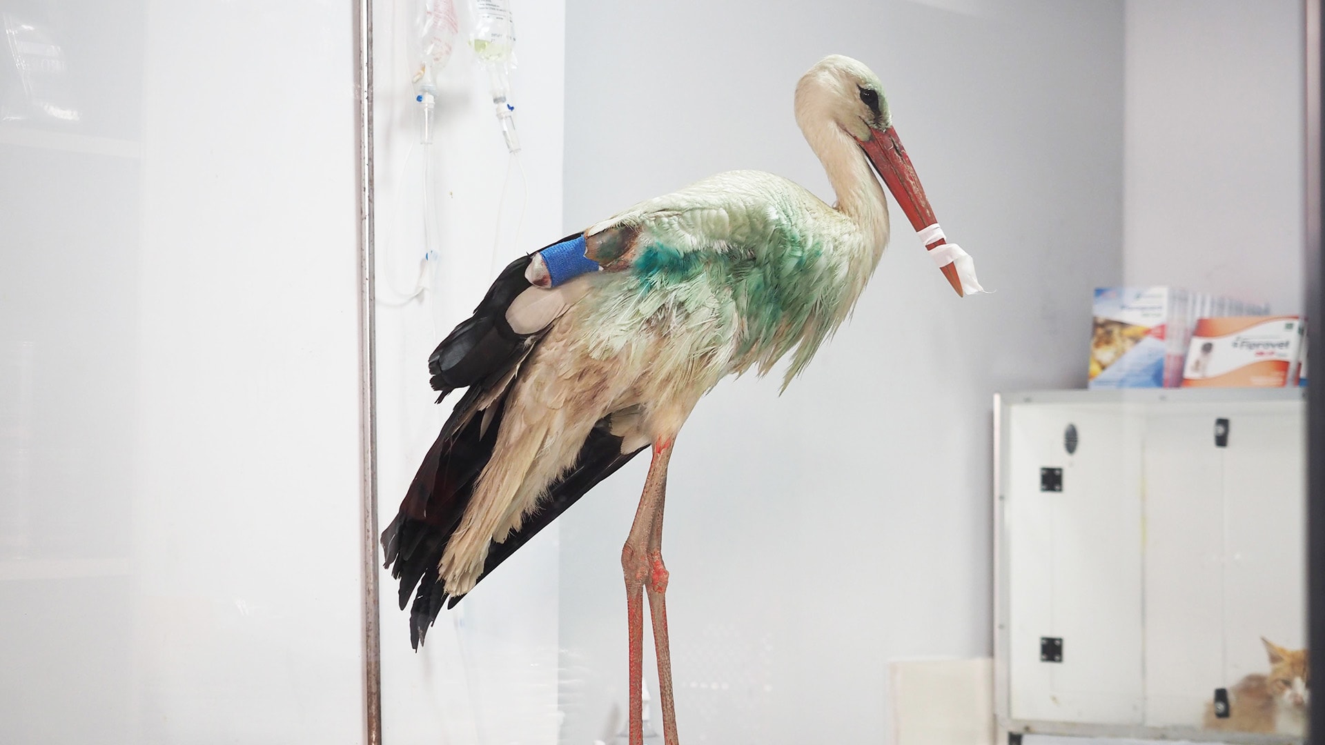 Bölgeye gelen dernek üyeleri, kanadından yaralı leyleği veterinere götürdü. Leyleğin kanadı isabet eden tüfek saçmaları nedeniyle ampute edildi.