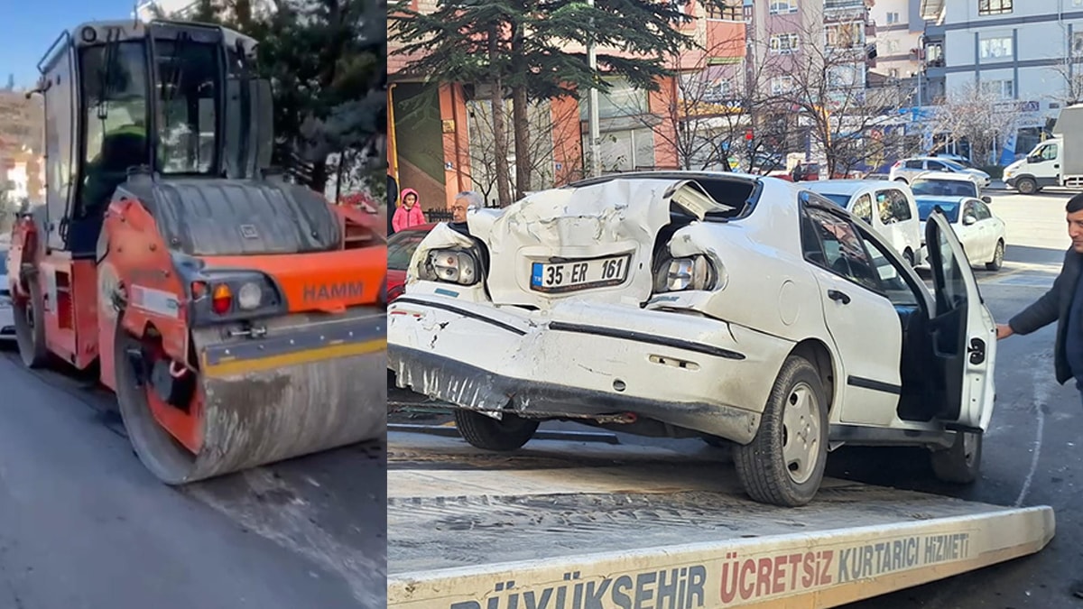 Mamak'ta Yeşilbayır mahallesinde asfalt serim çalışması yapan Ankara Büyükşehir Belediyesi'ne ait yol silindiri, operatörün kontrolünden çıkıp kaymaya başladı.