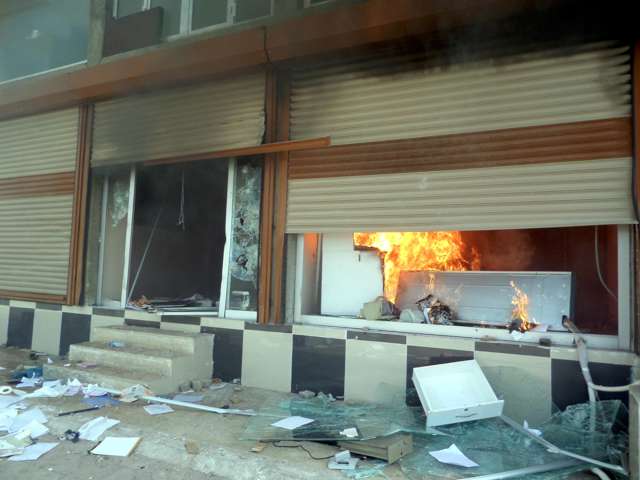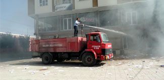 TIR ve kamyonları siper alan göstericiler de polise taşla karşılık verdi. İtfaiye ekipleri, binadaki yangına müdahale ederek söndürdü. Yangın büyümeden söndürüldü.