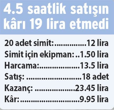 Bora ERDİN'le Sokak İşi- İstanbul trafiğinde en çok karşılaşılan sokak satıcıları simitçiler. Fırından çıkış fiyatı 60 kuruş olan simitin trafikte satış fiyatı 1 lira 50 kuruş. Ancak rekabet yoğun olduğu için satışlar düşük. 1 lira 50 kuruşa mal edilen bir simit taşıma aparatı ile İstanbul trafiğinde 4,5 saatte 18 simit satabildik. Ortalama 1 lira 30 kuruş satış fiyatı ile 9 lira 95 kuruş kâr elde ettik. Günlük ortalama 40 simit satan bir satıcının aylık kazancı 720 lirayı buluyor. Trafikte simit satışı diğer sokak işlerine oranla düşük kârı getiren işler arasında yer alıyor. Ayrıca trafik açıldığında satışlar tamamen durduğu için satıcılar trafiği yavaşlatmak adına küçük oyunlara başvuruyor.