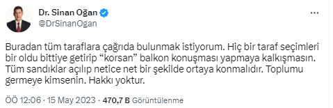 * Buradan tüm taraflara çağrıda bulunmak istiyorum. Hiç bir taraf seçimleri bir oldu bittiye getirip “korsan” balkon konuşması yapmaya kalkışmasın.