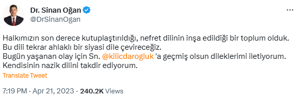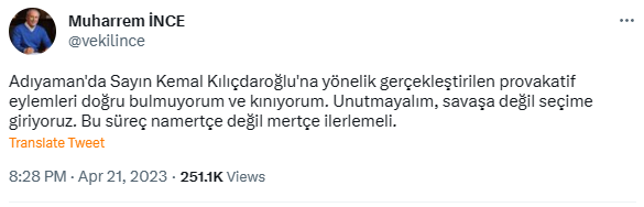 * Adıyaman'da Sayın Kemal Kılıçdaroğlu'na yönelik gerçekleştirilen provakatif eylemleri doğru bulmuyorum ve kınıyorum. Unutmayalım, savaşa değil seçime giriyoruz. Bu süreç namertçe değil mertçe ilerlemeli.