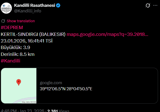 Kandilli Rasathanesi verilerine göre, Balıkesir’in Sındırgı ilçesinde deprem meydana geldi. Saat 16:41’de kaydedilen depremin büyüklüğü 3.9 olarak açıklandı.
