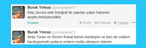 Galatasaray'ın başarılı futbolcusu Burak Yılmaz, gazetelerde kendisiyle ilgili çıkan haberleri twitter hesabından yalanladı. Arda Turan'ın eski nişanlısı Sinem Kobal'la Dilara Endican'ın evinde buluştuğu iddia edilen Yılmaz, sosyal medya hesabından zehir zemberek açıklamalarda bulundu. İşte Burak Yılmaz'ı kızdıran haber ve twitter hesabından verdiği yanıt;Milli futbolcu Arda Turan'la evliliğin eşiğinden dönen Sinem Kobal ile bir başka milli futbolcu Burak Yılmaz, önceki gece sürpriz buluşmalarıyla kafaları karıştırdı. Güzel oyuncu, önceki gece Galatasaray Tekerlekli Basketbol Şubesi sorumlusu olan yakın dostu Dilara Endican'ın Kuruçeşme'deki evine gitti. İlerleyen saatlerde Galatasaray'ın yıldız golcüsü ve Arda Turan'ın yakın arkadaşı olan Burak Yılmaz da soluğu Endican'ın evinde aldı.