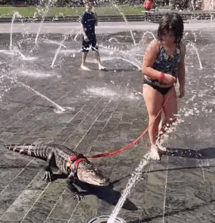 Sosyal medyada yayılan videoda, timsahın tasmasıyla dolaştığı, insanları selamladığı ve bir noktada serinlemek için bir su birikintisinde karnının üzerinde yattığı görülüyor.
