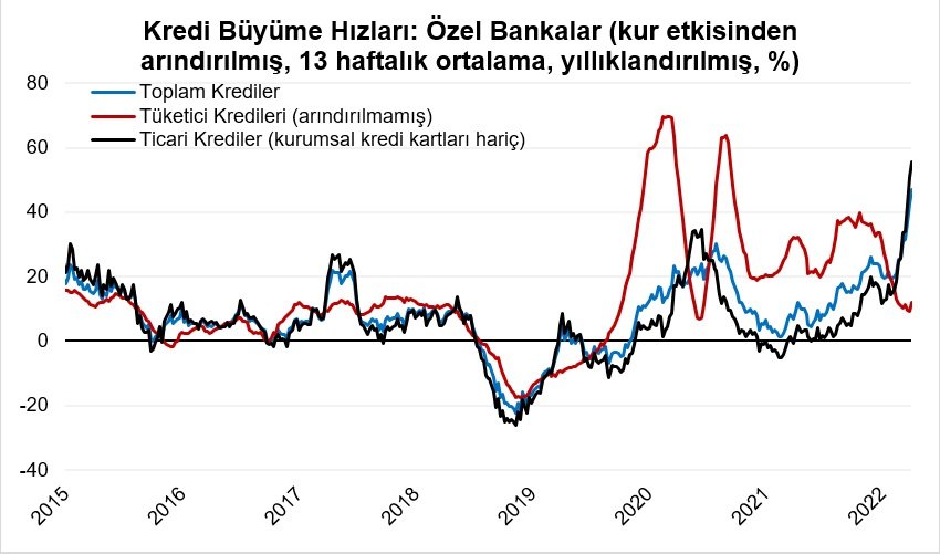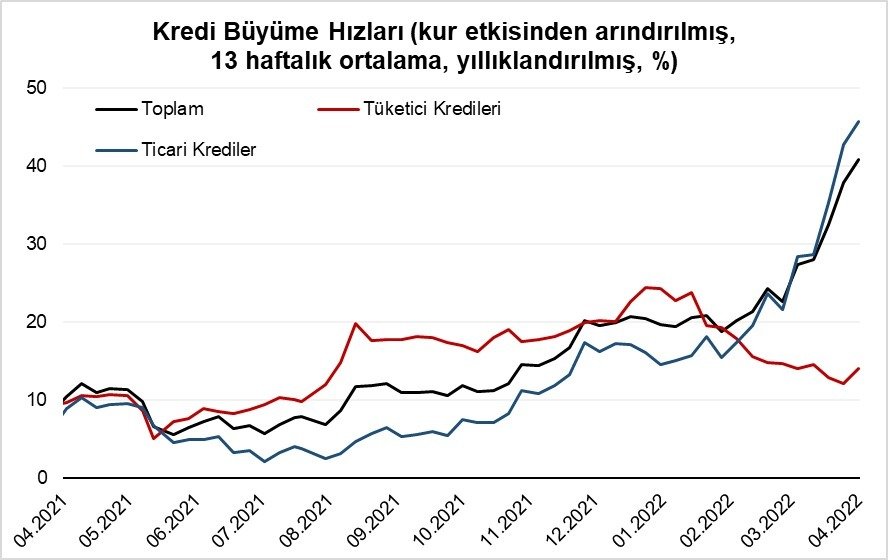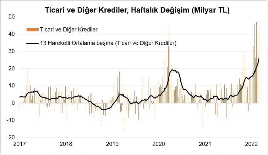 2022’nin ilk üç ayında toplam TL kredi hacmi 380 milyar TL artarken, bu artışın yüzde 90’ı ticari krediler kaynaklı oldu.