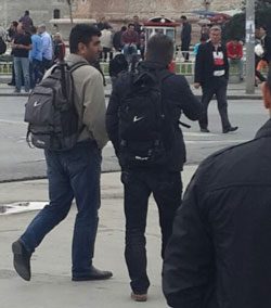 Sivil giyinimli polislerin sırt çantalarında taşıdıkları coplar görünüyor.