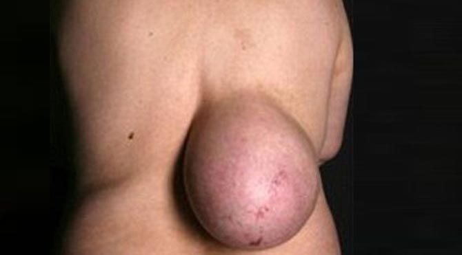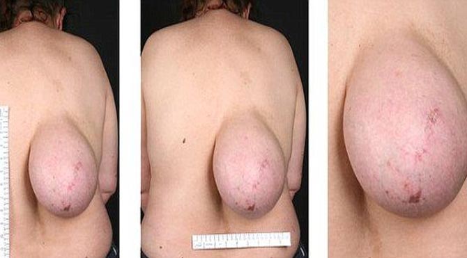 İrlanda'nın Dublin kentinde yaşayan 46 yaşındaki kadının sırtında 2 kilo 700 gram ağırlığında ve meme şeklinde bir tümör çıktı. Talihsiz kadının sırtında tümörün ise tıpta lipoma denilen bir çeşit yağ tümörüydü. Son 10 yıldır sırtında tümörle yaşayan hasta, son 3 senedir tümörün hızla büyüdüğünü söyledi. 19 santim boyunda 6.7 santim genişliğinde olan tümörü gören doktorlar ilk olarak kötü huylu bir tümör olmasından şüphelendi.