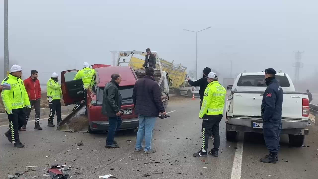 Elazığ-Malatya kara yolu 20'nci kilometrede sürücülerinin isimleri öğrenilmeyen cip, 2 kamyonet, hafif ticari araç, TIR, kamyon ile plakası öğrenilmeyen bir otomobil, sis ve buzlanma nedeniyle çarpıştı.