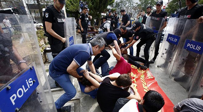 (DHA) - Sabah saatlerinden bu yana geniş güvenlik önlemlerinin alındığı acil servis önüne gelerek yere oturan 8 kişi "Hatice Aşık onurumuzdur, Tayad'lı aileler" yazılı pankart açtı. Polis, yerde bir süre oturan eylemcilere, pankartı toplayarak eyleme son vermesi çağrısında bulundu. Oturma eyleminin devam etmesi üzerine müdahalede bulunan çevik kuvvet ekipleri, eylemcileri yere ters yatırarak kelepçeledi.POLİSTEN MÜDAHALE