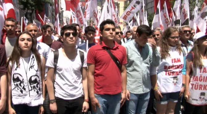 Ellerinde Atatürk ları, bayraklar, flamalar ve üzerinde 'Türkiye'yi böldürmeyiz, Cumhuriyeti yıktırmayız' yazılı Türkiye haritası taşıyan kalabalık, 'Atatürk gençliği görev başında", "Mustafa Kemal'in askerleriyiz" ve "Türkiye laiktir laik kalacak" sloganları attı.