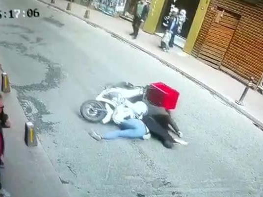 Bu sırada yolun aşağısından gelen bir moto kurye kadına çarptıktan sonra devriliyor. Kazayı gören vatandaşlar, bacağı kırılan kadın ile kısa süreli baygınlık geçiren kuryenin yardımına koşuyor.