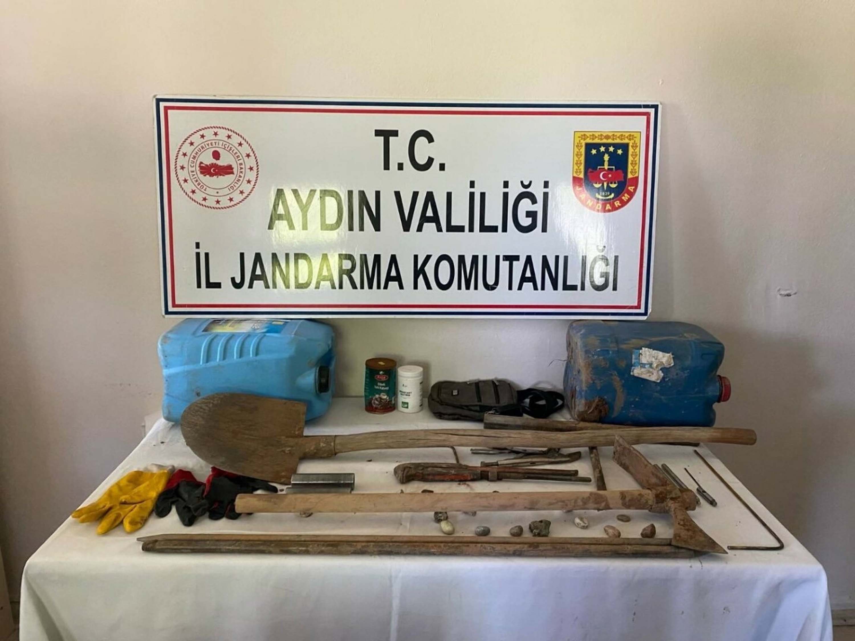 Kaçak kazı yapılan alandaki aramalarda; 1 çapa, 1 kürek, 1'er metre uzunluğunda 4 demir çubuk, 1 bidon, 1'i titanyum diğeri pirinç alaşımlı toplam 2 alan tarama çubuğu ve 2 bronz yüzük ele geçirildi.