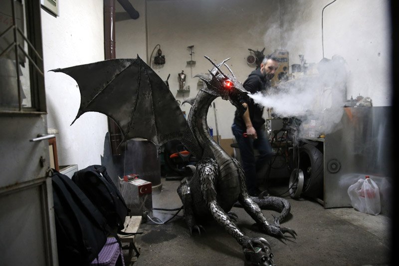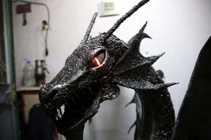 Selçuklu Mahallesi'nde kaynak ustalığı yapan meslek lisesi mezunu 37 yaşındaki İbrahim Doğan, metal malzemelerin yanı sıra hurda parçalar da kullanarak yaklaşık 4 ayda 160 santimetre boyunda ve yaklaşık 80 kilo ağırlığında "ejderha" yaptı.