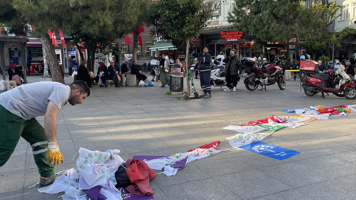 Bu kapsamda, Fatih'te belediye temizlik ekipleri meydan, cadde ve sokaklardaki siyasi parti bayraklarını topluyor.