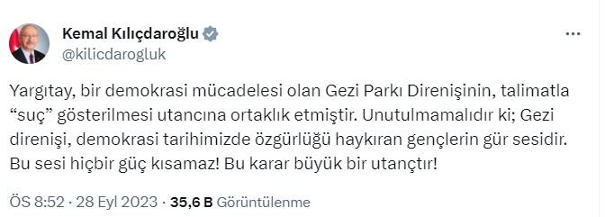 CHP Genel Başkanı Kemal Kılıçdaroğlu, sosyal medya platformu X’ye yaptığı paylaşımda “Yargıtay, bir demokrasi mücadelesi olan Gezi Parkı Direnişinin, talimatla ‘suç’ gösterilmesi utancına ortaklık etmiştir. Unutulmamalıdır ki; Gezi direnişi, demokrasi tarihimizde özgürlüğü haykıran gençlerin gür sesidir. Bu sesi hiçbir güç kısamaz! Bu karar büyük bir utançtır!” diye yazdı.
