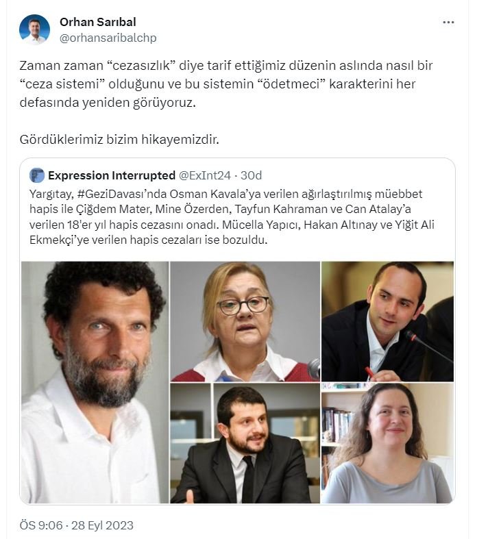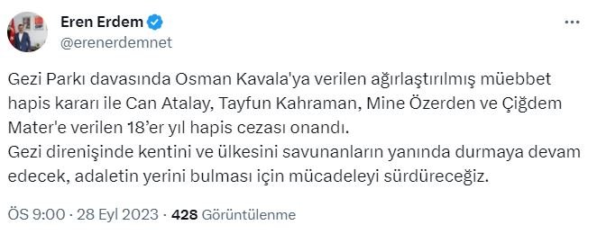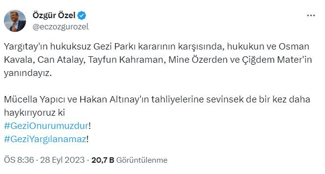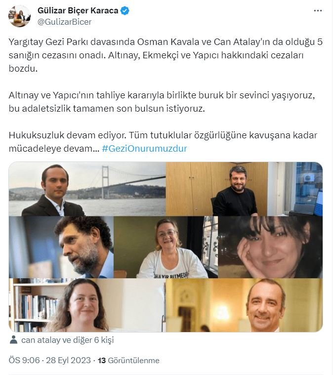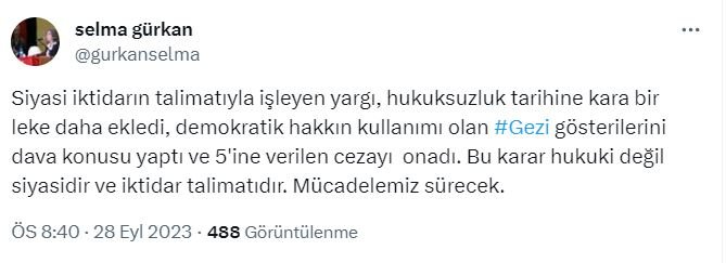 "Yargıtay'ın hukuksuz Gezi Parkı kararının karşısında, hukukun ve Osman Kavala, Can Atalay, Tayfun Kahraman, Mine Özerden ve Çiğdem Mater'in yanındayız. Mücella Yapıcı ve Hakan Altınay'ın tahliyelerine sevinsek de bir kez daha haykırıyoruz ki #GeziOnurumuzdur! #GeziYargılanamaz!"