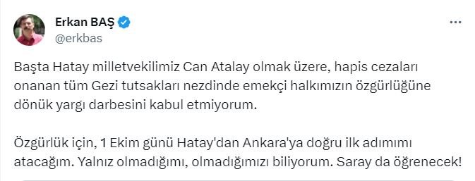TİP Genel Başkanı Erkan Baş, karara karşı 1 Ekim'de Hatay'dan Ankara'ya yürüyüş başlatacağını duyurdu: