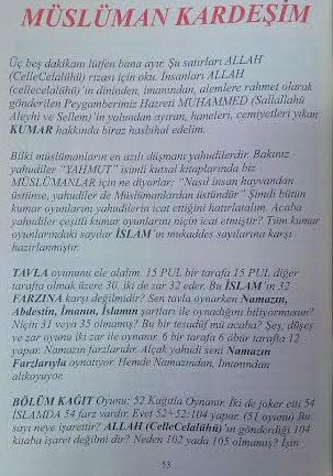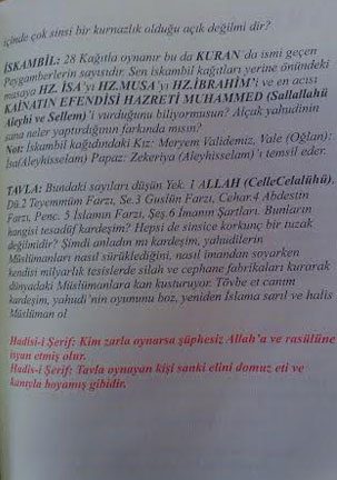TAVLA OYNAMAYIN: Tavladaki sayıları düşün. Yek, Allah. Dü, teyemmüm farzı, se, guslün farzı, cehar, abdestin farzı, penç, islamın farzı, şeş, imanın şartları. Şimdi anladın mı kardeşim Yahudiler’in Müslümanlar’ı nasıl sürüklediğini?