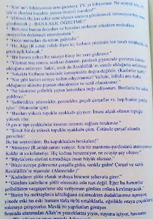 ÇARŞAFSIZ KADIN OLMAZ: Günümüz Müslüman kadınların giydikleri, abiye, manto, etek, bluz, pardösü gibi kıyafetlerin İslam’la uzaktan yakından alakası yoktur. Dağlar çakalsız, erkekler sakalsız, kadınlar çarşafsız olmaz. Yüzünü traş etmen, sarıksız durman da gavurun izinde olduğunu anlatır.
