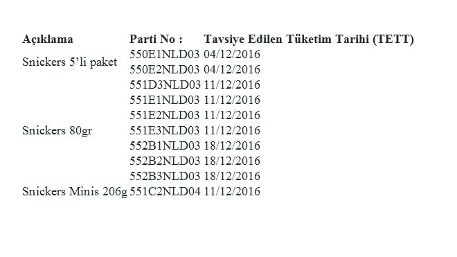 Söz konusu parti numarası ve Tavsiye Edilen Tüketim Tarihi (TETT) sahip olan SNICKERS® 5’li Paket, SNICKERS® 80 Gram ve SNICKERS® Minis 206 Gram ürünlerine sahip olan müşterilerimizin bu ürünleri tüketmemesi gerekmektedir. Daha fazla bilgi için bizimle iletişime geçebilirsiniz: