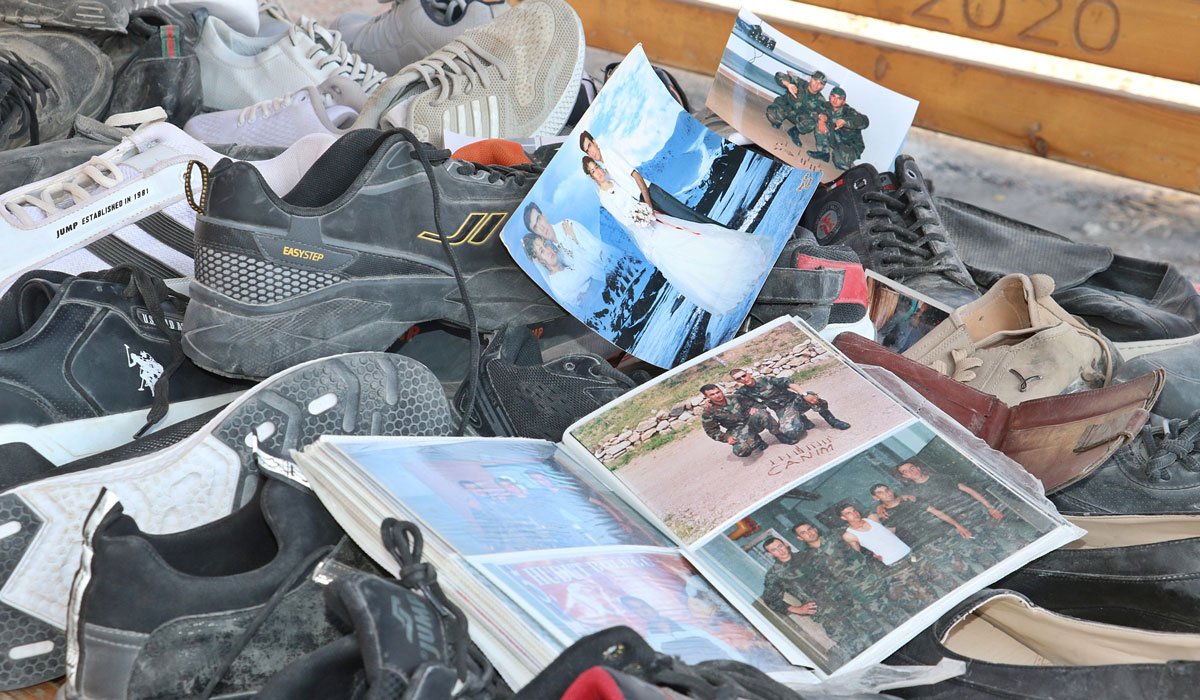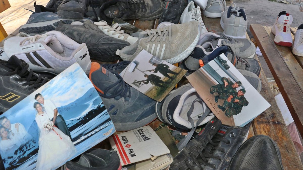 Her biri onlarca kişiye mezar olan Ali Taşı Mahallesi'ndeki Bozbey Apartmanının enkazından çıkarılan fotoğraflar bankın üzerine bırakıldı.