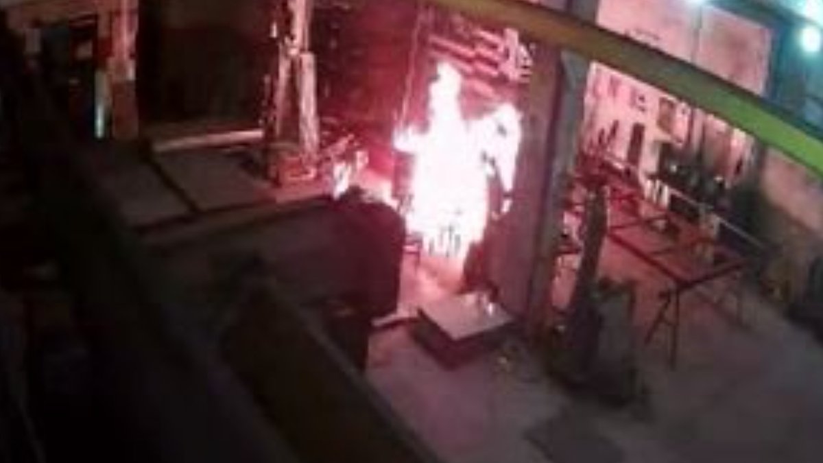Bu arada olay, iş yerinin güvenlik kamerasına yansıdı. Görüntülerde, Kaplan'ın sobaya tiner dökmesiyle birlikte alevler içinde kaldığı, koşarak kendisini dışarı attığı görüldü. (DHA)