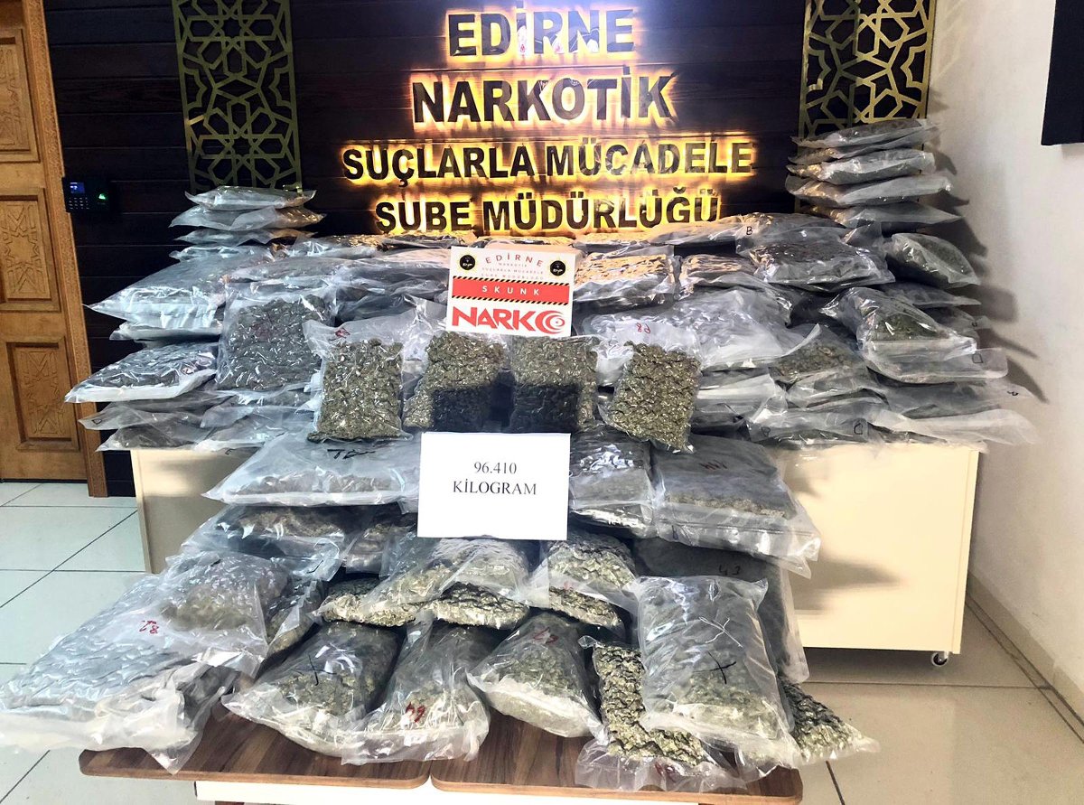 Taramaya alınan TIR'ın Bosna Hersek uyruklu şoförü A.C.'nin (39), araçtaki iki valizi çöp konteynerine attığı tespit edildi. A.C., gözaltına alırken, çöpe atılan valizlerde yapılan aramada 135 paket halinde 96 kilo 410 gram skunk ele geçirildi.