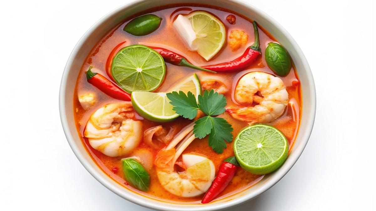 Tom Yum çorbasının temel bileşenleri karides, tavuk veya tofu ile yapılan çorbanın ana proteini, lezzetli ve besleyici olmasını sağlarken limon otu, çorbaya karakteristik bir aroma katıyor. Kaffir limon yaprakları, çorbaya ekşimsi bir tat verirken, kırmızı biber de acılığı artırır. Balık sosu ve limonsuyu, çorbanın tadını derinleştirirken asidik dengesini sağlar. Domates ve soğan ise zengin tatlar ekler, kişniş ise taze bir bitkisel dokunuş sunar.