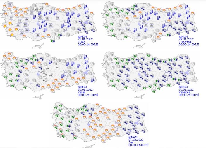 Meteoroloji Genel Müdürlüğü tarafından yapılan son değerlendirmelere göre: Ülkemiz genelinin parçalı ve çok bulutlu, Batı Karadeniz'in iç kesimleri, (Adıyaman hariç) Güneydoğu Anadolu Bölgesi, Doğu Anadolu'nun güneydoğusu ve Hatay çevrelerinin yağışlı geçeceği, yağışların Hatay çevrelerinde yağmur, diğer yerlerde karla karışık yağmur ve kar şeklinde görüleceği tahmin ediliyor.