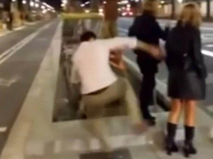 Kadının sol bacağına tekme atan Montealegre, neye uğradığını şaşıran kadının yere düşmesiyle olay yerinden kaçıyor.