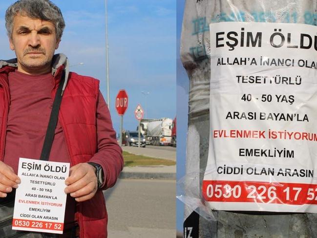 Ordu'nun Ünye ilçesinde 60 yaşındaki Ferhat Kara, sokaklara astığı ilanla eş arıyor.