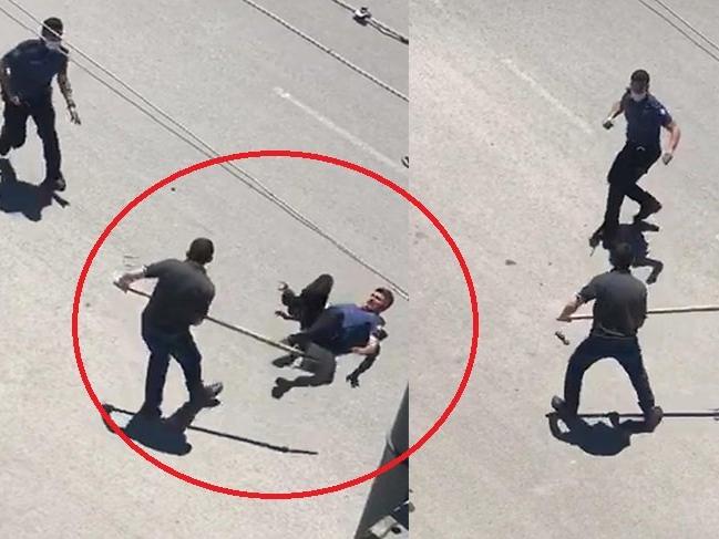 Şoke eden görüntüler! Polise kürekle saldırdı!