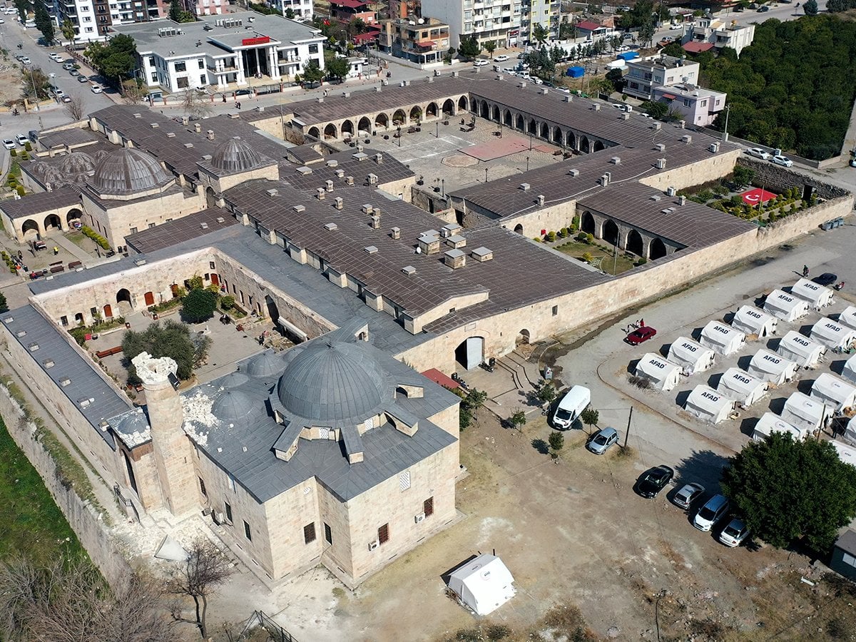 Kervansarayın geniş avlusu, etrafında kervanların ve yolcuların geceyi geçirdikleri kubbeli odalar ile külliyenin dışında kurulan çadırlarda 350 depremzede barınıyor.