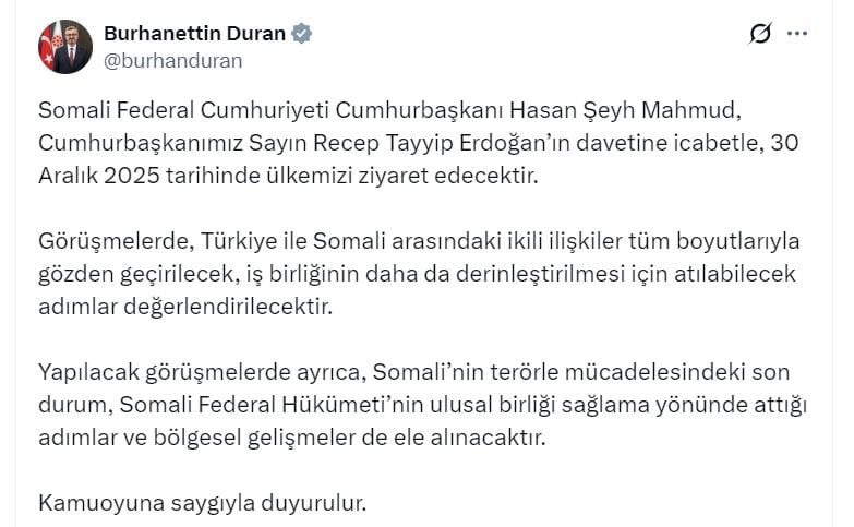 İletişim Başkanı Burhanettin Duran, Somali Federal Cumhuriyeti Cumhurbaşkanı Hasan Şeyh Mahmud’un 30 Aralık 2025 tarihinde Türkiye’yi ziyaret edeceğini açıkladı. Duran, sosyal medya hesabından yaptığı paylaşımda, ziyaretin Cumhurbaşkanı Recep Tayyip Erdoğan’ın davetiyle gerçekleşeceğini belirtti.
