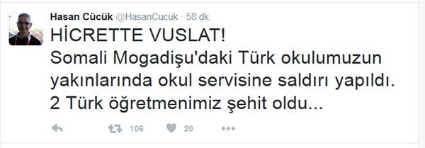 Haber sosyal medyadan bazı gazetecilerin kişisel hesaplarında, "MEKANLARI CENNET OLSUN... Mogadişu'daki hain terör saldırısında 2 Türk öğretmenimiz şehit oldu, 4 öğrencimiz yaralı. HİCRETTE VUSLAT!.. Somali Mogadişu'daki Türk okulumuzun yakınlarında okul servisine saldırı yapıldı. 2 Türk öğretmenimiz şehit oldu..." diyerek duyuruldu