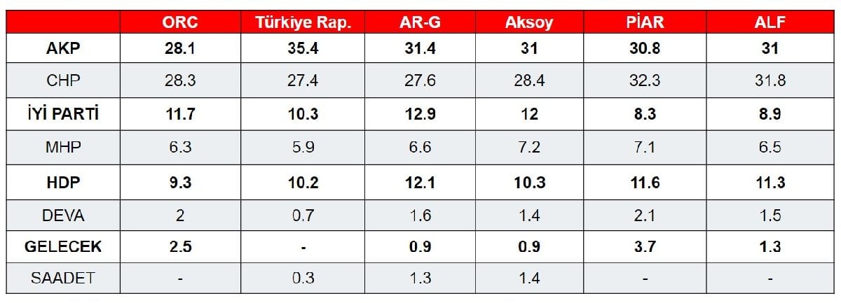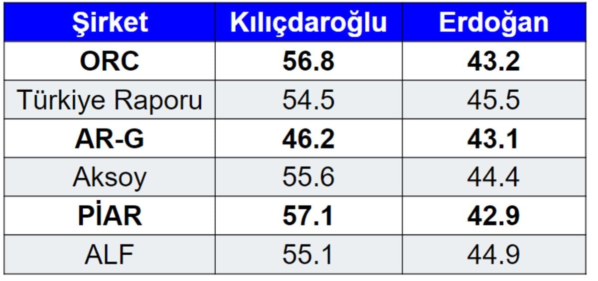 ORC, Türkiye Raporu, AR-G, Aksoy, PİAR ve ALF'nin mart ayı içerisinde paylaştığı seçim anketi sonuçlarına göre partilerin ve cumhurbaşkanı adaylarının aldığı oy oranları şöyle: