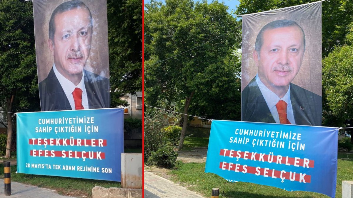 CHP’nin astığı afişin alt kısmında yer alan “28 Mayıs’ta tek adam rejimine son” yazılı bölüm kesildi. Bu durumu haber alan CHP Gençlik Kolları Başkanı Mithatcan Durur ile arkadaşları, kesilen afişi yenisiyle değiştirdi.
