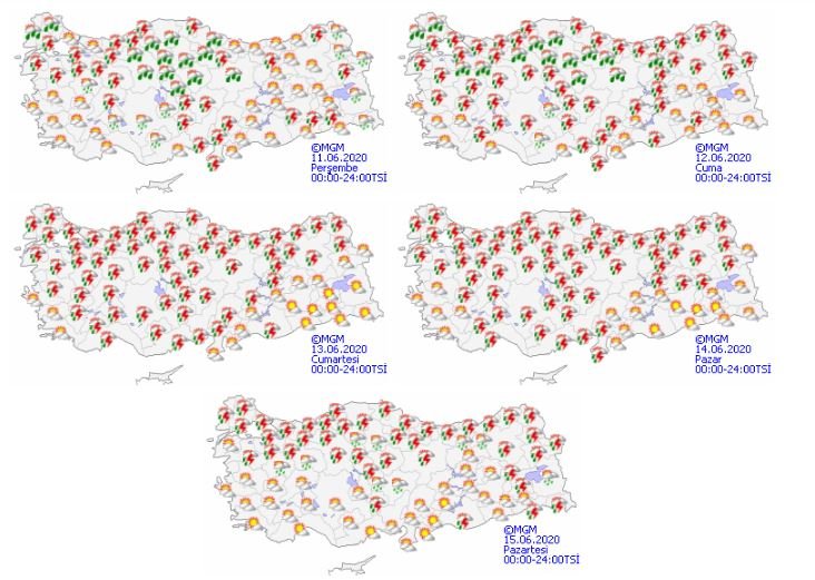 Yapılan son değerlendirmelere göre bugün Batı ve Orta Karadeniz’in iç kesimleri (Bolu, Düzce, Karabük, Kastamonu, Çorum, Amasya, Tokat ile Samsun, Sinop, Zonguldak ve Bartın illerinin iç kesimleri), Marmara’nın güney ve batısı (Bursa, Balıkesir, Edirne, Kırklareli, Tekirdağ’ın batı ilçeleri ve Çanakkale’nin doğu ilçeleri) ile İç Anadolu’nun kuzeyinde (Ankara, Çankırı, Kırıkkale ve Yozgat) yerel olarak kuvvetli sağanak ve gök gürültülü sağanak yağış beklendiğinden sel, su baskını, yıldırım, yerel dolu yağışı, yağış anında kuvvetli rüzgar, ulaşımda aksamalar gibi olumsuzluklara karşı dikkatli ve tedbirli olunmalıdır.