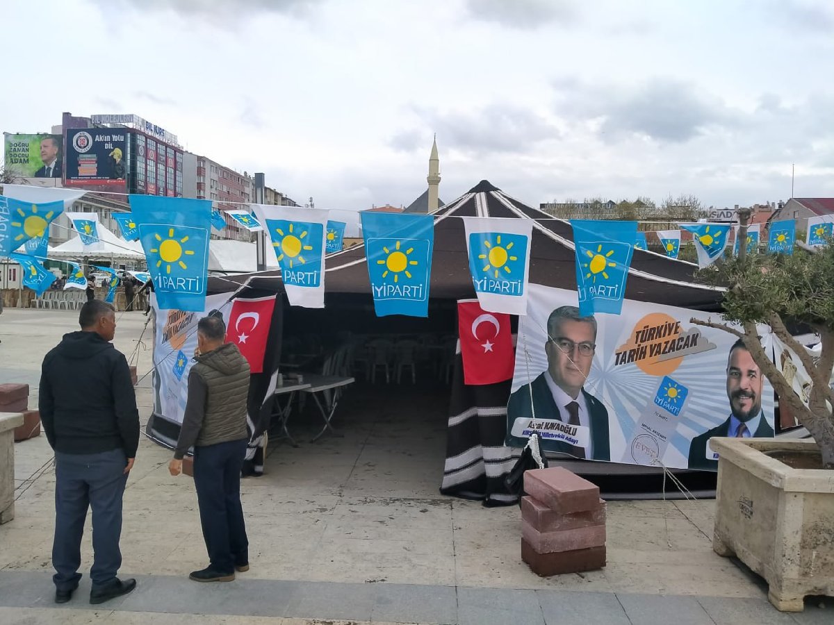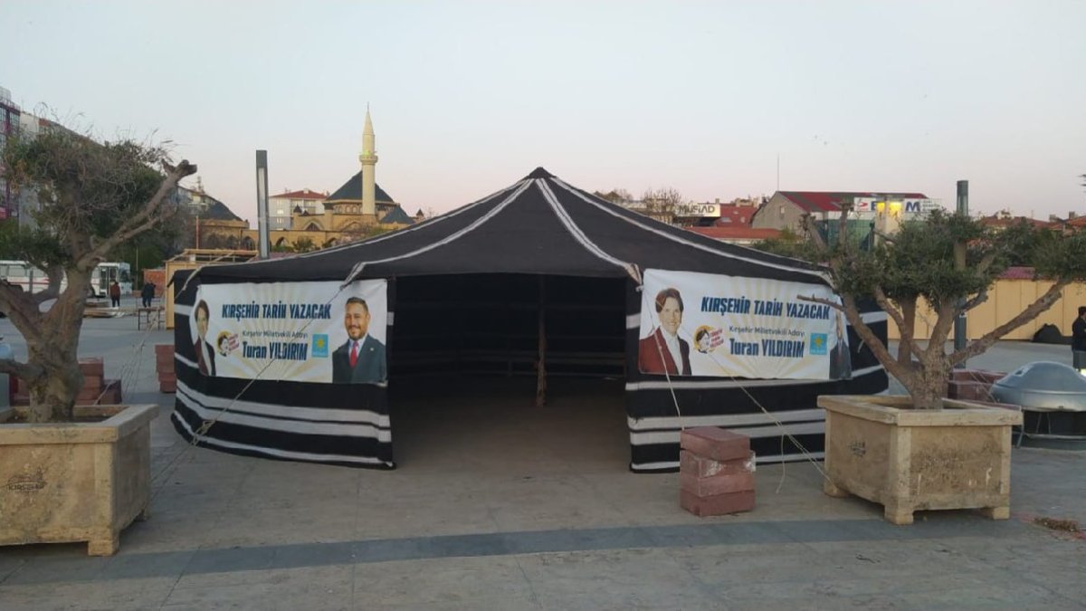 "AK Parti tarafından 28 Nisan 2023 tarihinde yapılan şikâyet neticesinde, yine aynı tarihte Kırşehir Merkez İlçe Seçim Kurulu’nun ikiye karşı beş oy ile aldığı kararla Cacabey Meydanında bulunan Türk otağının kaldırılması ve vatandaşlarımıza su ve çay ikramının yapılmasının durdurulması tebliğ edildi.