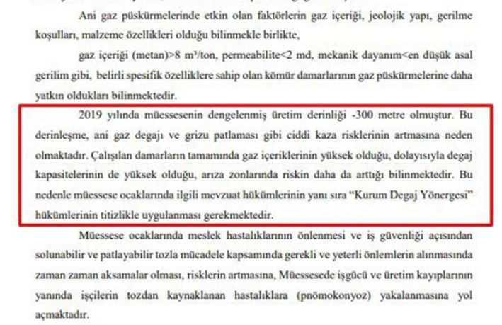 Çalışan damarların tamamında gaz içeriklerinin yüksek olduğu dolayısıyla degaj kapasitelerinin de yüksek olduğunu, arıza zonlarında riskin daha da arttığı bilinmektedir diyerek tedbir alın diye uyarıyor. Ve gaz içerikleri de ölçmüş, tabloda onların yüksek olduğunu da belirtmiş" dedi.