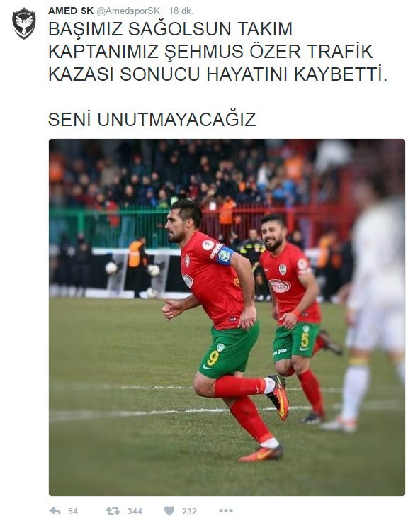 Kendisinden gündürlerdir haber alınamayan Şehmus Özer ile ilgili takımın Twitter hesabından yapılan açıklamada şu ifadelere yer verildi: "Amedspor Takım Kaptanı Şehmuz Özer'i Trafik Kazasında Kaybettik. Başımız Sağolsun... Güzel İnsan, Koca yürekli Lider,Kaptan. Seni Unutmayacağız Büyük Golcü...."