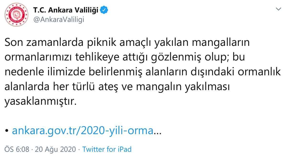 * Ormanlık alanlar ile ormanlık alanların civarında izin verilen ve karar ekinde listelenerek ilan edilen piknik mesire yerleri, milli parklar ve tabiat parklarında 31.10.2020 tarihine kadar saat 20.00’dan sonra mangal / semaver / ateş yakılması yasaktır.