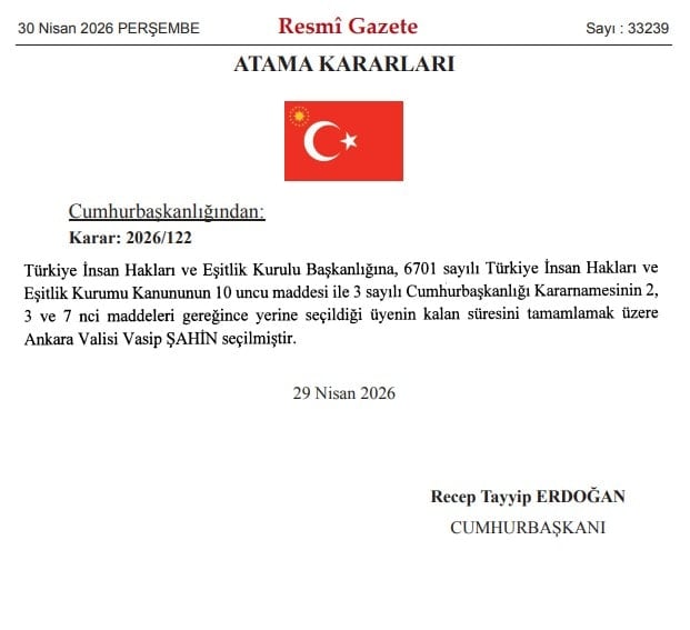 Aydın Valisi Yakup Canbolat, Ankara Valiliğine atanırken, Ankara Valisi Vasip Şahin ise Türkiye İnsan Hakları ve Eşitlik Kurulu Başkanlığı’na seçildi.